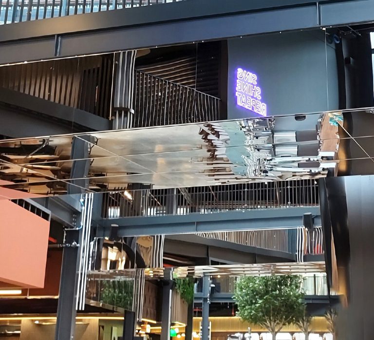 The stainless steel panels reflect the surroundings exactly. The highly reflective mirror surface of Hoba Steel’s stainless steel creates a visual continuation of the space, adding depth.
