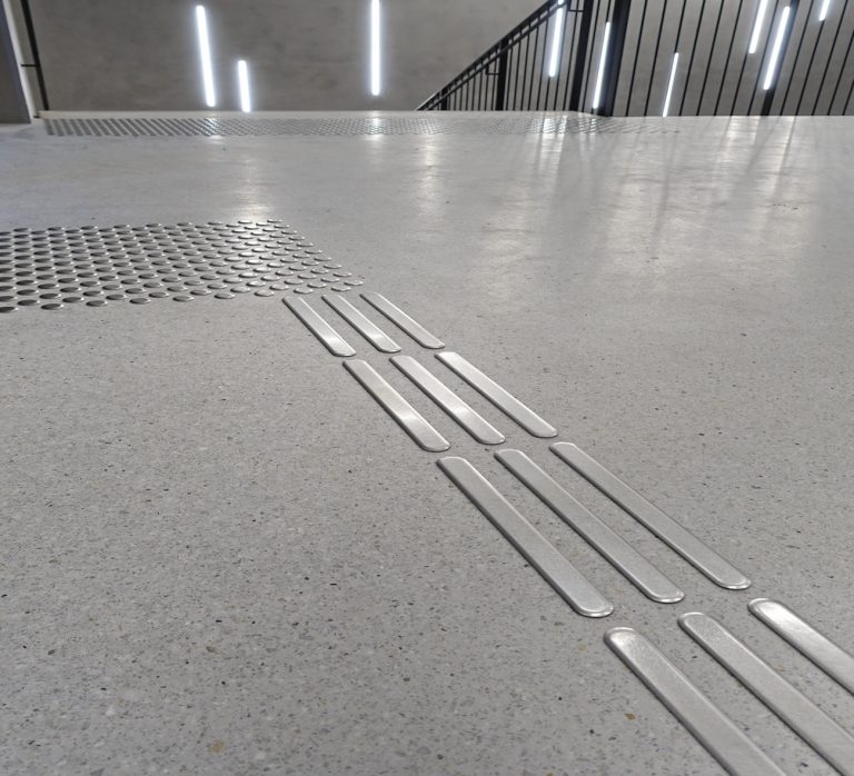 Hoba Steel SPIIN® SAFE individual indicators with a project-specific adhesive system were selected to realise the tactile guidance system. Visually recognisable guidelines consisting of SPIN® SAFE individual ribs provide orientation and guide visitors to the target areas that are accessible to the public. The Hoba Steel SPIN® SAFE individual studs form the attention fields that warn of danger points and level changes and the turning fields that provide information about changing direction.