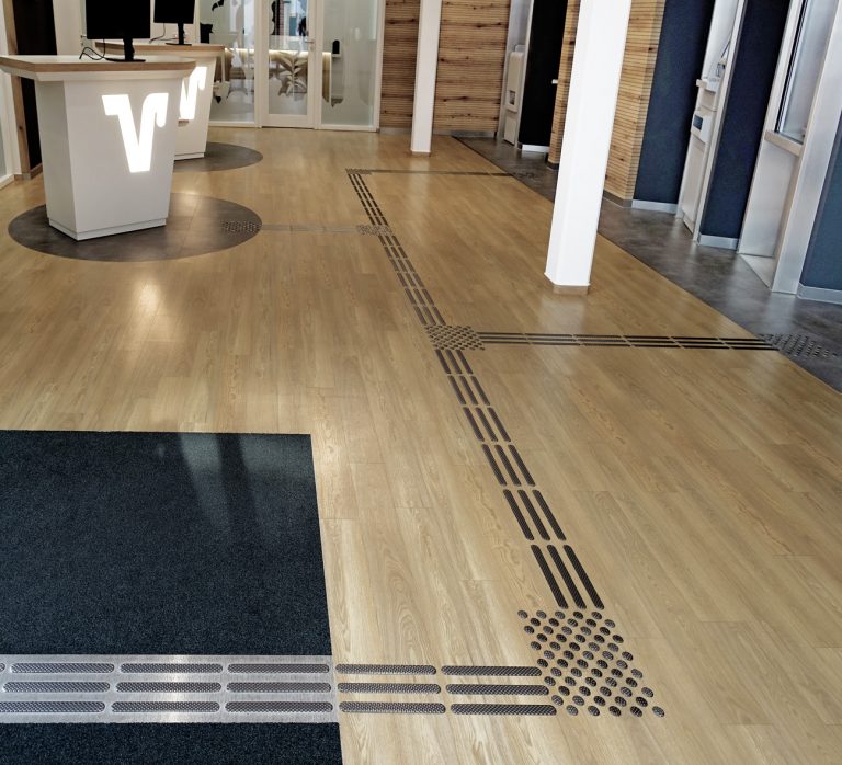 Die Bodenindikatoren bieten ausreichend Kontrast durch ihre spezielle Farbe und Oberfläche. Sie sind in Anlehnung an DIN 32984 und DIN 32975 entwickelt worden. Im Bereich der Sauberlaufmatte am Eingang wurde aus zwei Edelstahloberflächen mit den Rutschhemmungsklassen R11 und R12 projektspezifisch ein Leitstreifen realisiert, der visuell deutlich erkennbar ist und den Besucher in den Innenraum führt.